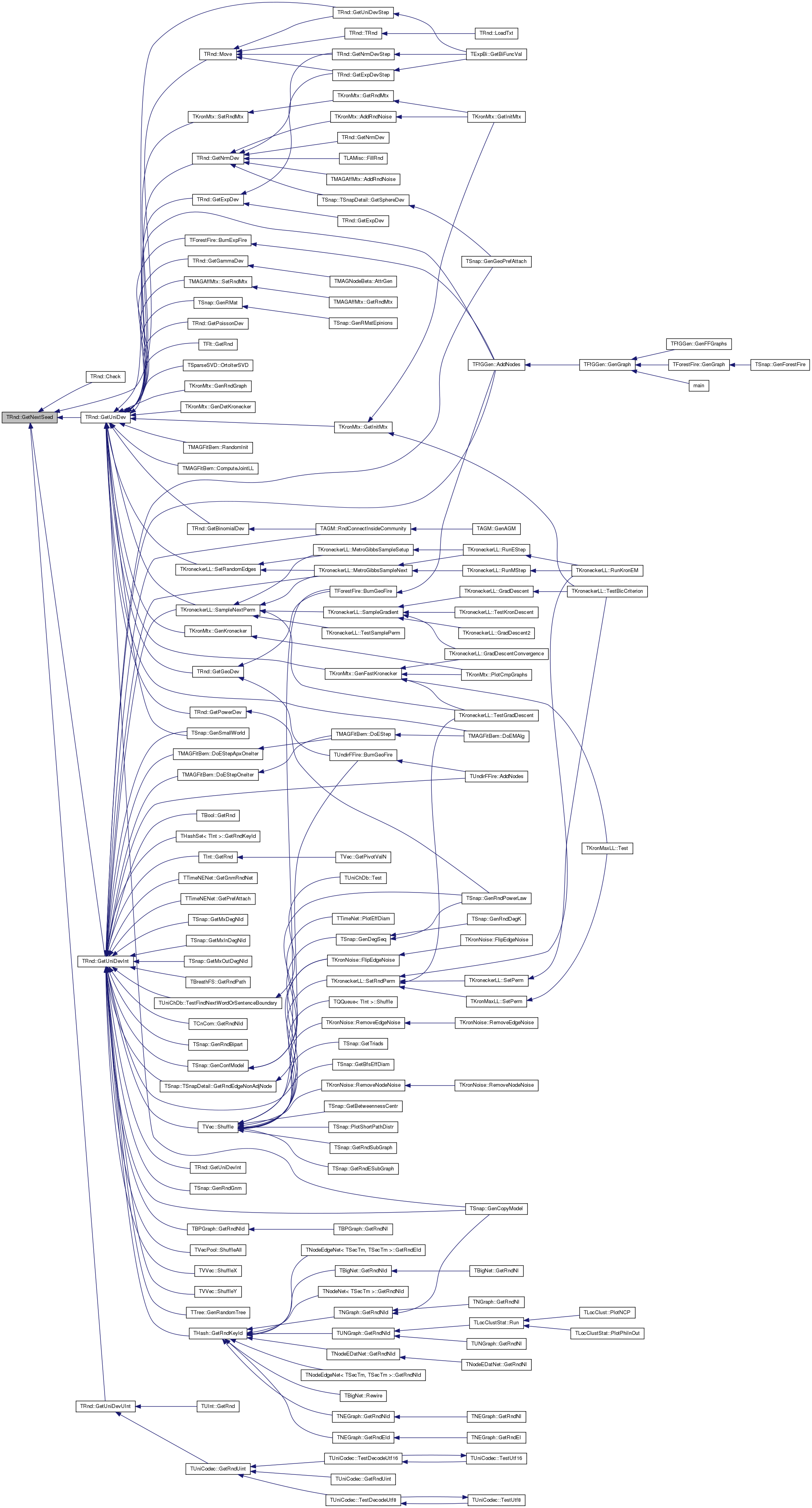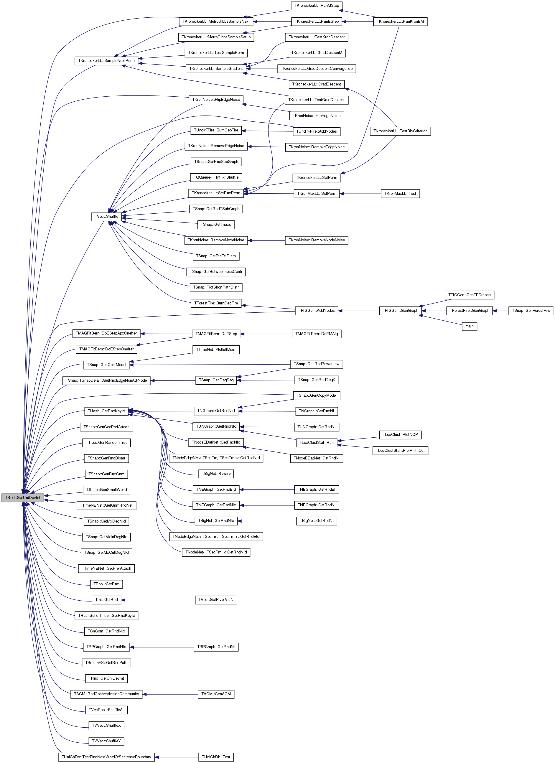 Referenced by TFfGGen::AddNodes(), TUndirFFire::AddNodes(), TMAGFitBern::DoEStepApxOneIter(), TMAGFitBern::DoEStepOneIter(), TKronNoise::FlipEdgeNoise(), TSnap::GenConfModel(), TSnap::GenCopyModel(), TSnap::GenGeoPrefAttach(), TTree< TVal >::GenRandomTree(), TSnap::GenRndBipart(), TSnap::GenRndGnm(), TSnap::GenSmallWorld(), TTimeNENet::GetGnmRndNet(), TSnap::GetMxDegNId(), TSnap::GetMxInDegNId(), TSnap::GetMxOutDegNId(), TTimeNENet::GetPrefAttach(), TBool::GetRnd(), TInt::GetRnd(), TSnap::TSnapDetail::GetRndEdgeNonAdjNode(), THash< TKey, TDat, THashFunc >::GetRndKeyId(), THashSet< TInt >::GetRndKeyId(), TCnCom::GetRndNId(), TBPGraph::GetRndNId(), TBreathFS< PGraph >::GetRndPath(), GetUniDevInt(), TKroneckerLL::MetroGibbsSampleNext(), TAGM::RndConnectInsideCommunity(), TKroneckerLL::SampleNextPerm(), TVec< TVal >::Shuffle(), TVecPool< TVal >::ShuffleAll(), TVVec< TVal >::ShuffleX(), TVVec< TVal >::ShuffleY(), and TUniChDb::TestFindNextWordOrSentenceBoundary().