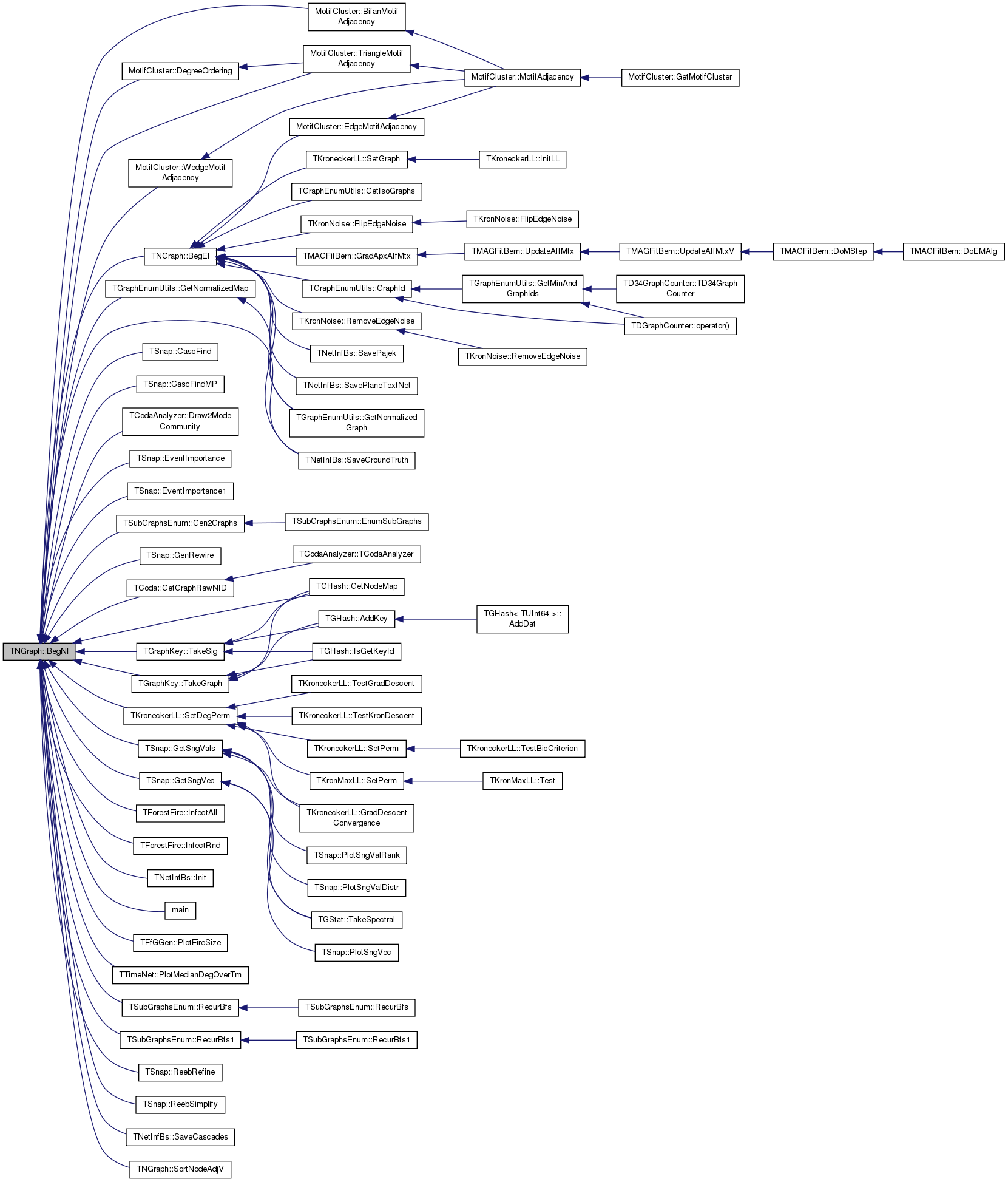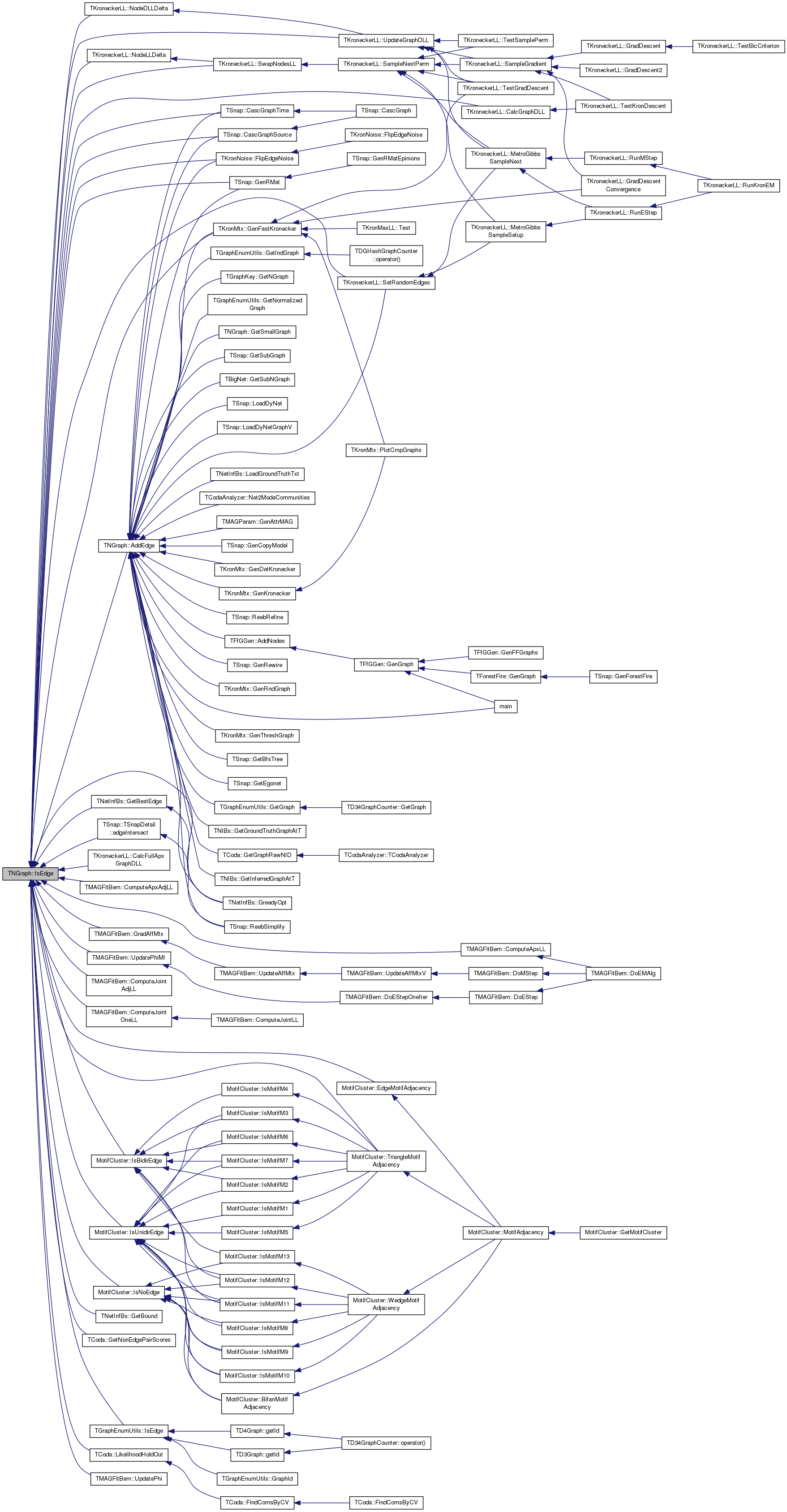 Referenced by AddEdge(), TKroneckerLL::CalcFullApxGraphDLL(), TKroneckerLL::CalcGraphDLL(), TSnap::CascGraphSource(), TSnap::CascGraphTime(), TMAGFitBern::ComputeApxAdjLL(), TMAGFitBern::ComputeApxLL(), TMAGFitBern::ComputeJointAdjLL(), TMAGFitBern::ComputeJointOneLL(), TSnap::TSnapDetail::edgeIntersect(), MotifCluster::EdgeMotifAdjacency(), TKronNoise::FlipEdgeNoise(), TKronMtx::GenFastKronecker(), TSnap::GenRMat(), TNetInfBs::GetBestEdge(), TNetInfBs::GetBound(), TCoda::GetNonEdgePairScores(), TMAGFitBern::GradAffMtx(), TNetInfBs::GreedyOpt(), MotifCluster::IsBidirEdge(), TGraphEnumUtils::IsEdge(), MotifCluster::IsNoEdge(), MotifCluster::IsUnidirEdge(), TCoda::LikelihoodHoldOut(), TKroneckerLL::NodeDLLDelta(), TKroneckerLL::NodeLLDelta(), TKroneckerLL::SetRandomEdges(), TKroneckerLL::SwapNodesLL(), MotifCluster::TriangleMotifAdjacency(), TKroneckerLL::UpdateGraphDLL(), TMAGFitBern::UpdatePhi(), and TMAGFitBern::UpdatePhiMI().