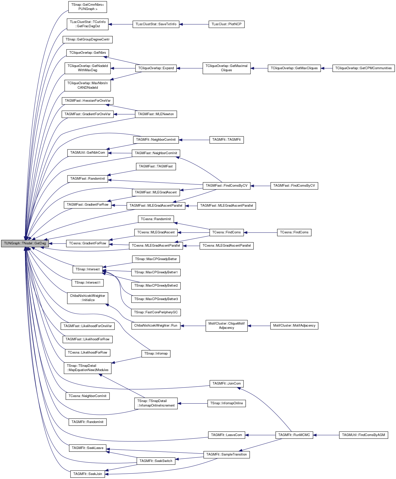 Referenced by TSnap::GetCmnNbrs< PUNGraph >(), TLocClustStat::TCutInfo::GetFracDegOut(), TSnap::GetGroupDegreeCentr(), TAGMUtil::GetNbhCom(), TCliqueOverlap::GetNbrs(), TCliqueOverlap::GetNodeIdWithMaxDeg(), TAGMFast::GradientForOneVar(), TAGMFast::GradientForRow(), TCesna::GradientForRow(), TAGMFast::HessianForOneVar(), TSnap::Infomap(), TSnap::TSnapDetail::InfomapOnlineIncrement(), ChibaNishizekiWeighter::Initialize(), TSnap::Intersect(), TSnap::Intersect1(), TAGMFit::JoinCom(), TAGMFit::LeaveCom(), TAGMFast::LikelihoodForOneVar(), TAGMFast::LikelihoodForRow(), TCesna::LikelihoodForRow(), TSnap::TSnapDetail::MapEquationNew2Modules(), TCliqueOverlap::MaxNbrsInCANDNodeId(), TAGMFast::MLEGradAscent(), TAGMFast::MLEGradAscentParallel(), TCesna::MLEGradAscentParallel(), TAGMFast::MLENewton(), TAGMFast::NeighborComInit(), TAGMFit::NeighborComInit(), TCesna::NeighborComInit(), TAGMFast::RandomInit(), TAGMFit::RandomInit(), TCesna::RandomInit(), TAGMFit::SeekJoin(), TAGMFit::SeekLeave(), and TAGMFit::SeekSwitch().