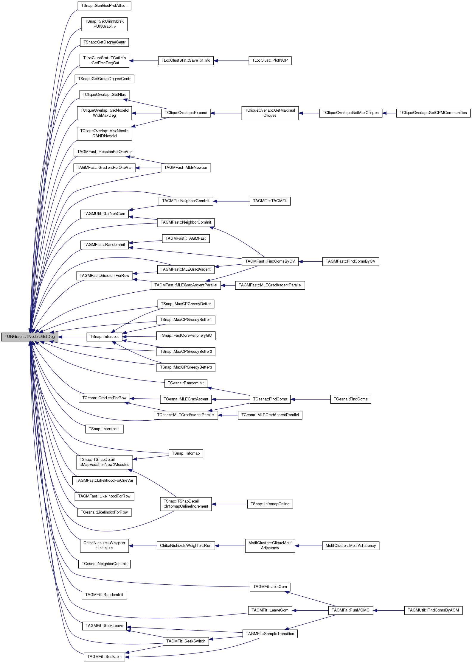 Referenced by TSnap::GetCmnNbrs< PUNGraph >(), TLocClustStat::TCutInfo::GetFracDegOut(), TSnap::GetGroupDegreeCentr(), TAGMUtil::GetNbhCom(), TCliqueOverlap::GetNbrs(), TAGMFast::GradientForOneVar(), TAGMFast::GradientForRow(), TCesna::GradientForRow(), TAGMFast::HessianForOneVar(), TSnap::Infomap(), TSnap::TSnapDetail::InfomapOnlineIncrement(), ChibaNishizekiWeighter::Initialize(), TSnap::Intersect(), TSnap::Intersect1(), TAGMFit::JoinCom(), TAGMFit::LeaveCom(), TAGMFast::LikelihoodForOneVar(), TAGMFast::LikelihoodForRow(), TCesna::LikelihoodForRow(), TSnap::TSnapDetail::MapEquationNew2Modules(), TSnap::MaxCPGreedyBetter(), TSnap::MaxCPGreedyBetter1(), TSnap::MaxCPGreedyBetter2(), TSnap::MaxCPGreedyBetter3(), TCliqueOverlap::MaxNbrsInCANDNodeId(), TAGMFast::MLEGradAscent(), TAGMFast::MLEGradAscentParallel(), TCesna::MLEGradAscentParallel(), TAGMFast::MLENewton(), TAGMFast::NeighborComInit(), TAGMFit::NeighborComInit(), TCesna::NeighborComInit(), TAGMFit::RandomInit(), TAGMFit::SeekJoin(), TAGMFit::SeekLeave(), TAGMFit::SeekSwitch(), and MotifCluster::SemicliqueMotifAdjacency().